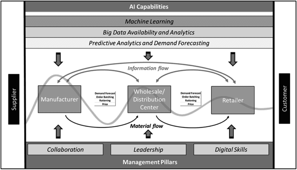 Laut der Studie kann KI den Bullwhip-Effekt abmildern, indem sie zentrale Managementfaktoren wie Zusammenarbeit, Führung und digitale Fertigkeiten verbessert. Diese Aspekte sind entscheidend für die erfolgreiche Integration von KI in Lieferketten und tragen maßgeblich zur Reduzierung von Nachfrageschwankungen bei.